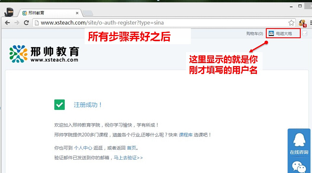 完成绑定后,右上角显示的就是你刚才填写的用户名。注:不填写系统默认用你的微博昵称。