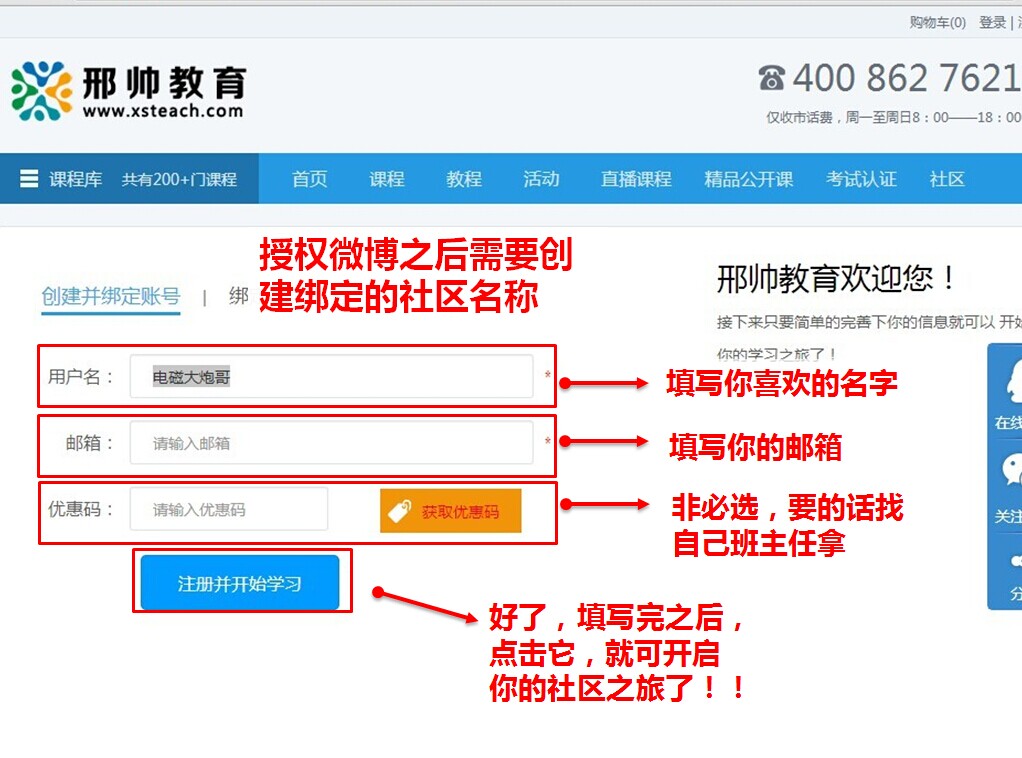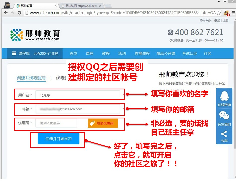 等你成功授权了之后,就会进入绑定社区用户名。你只需要输入用户名以及邮箱就可以完成注册。