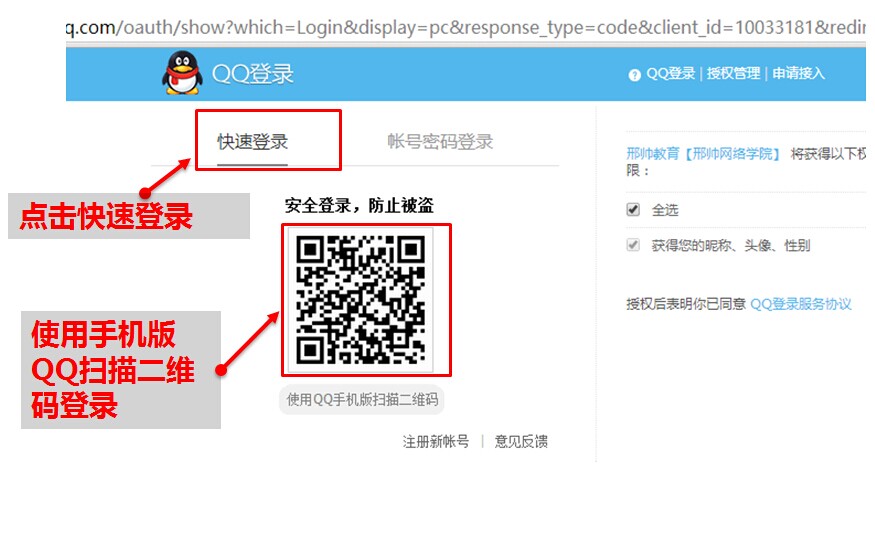 如果你还没登录QQ,则可以选择快速登录,用你手机QQ扫描二维码实现安全登录。