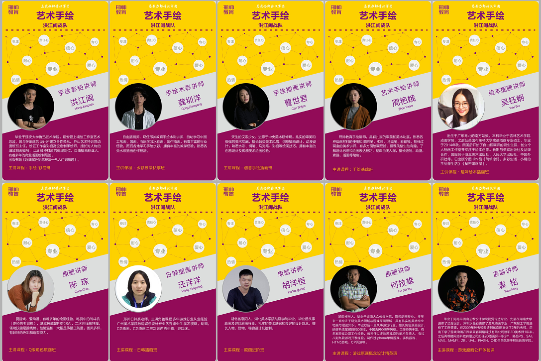 毕业于河南平顶山艺术设计学院视觉传达专业。先后在湖南大学进修了动漫设计,深圳水晶石进修了游戏动画专业,广东理工学院进修了工商管理,在2009年被老师邀请到东森画室做了2年的老师,后南下学了游戏动画在深圳亚客网络科技有限公司就职3D美术师1年半,之后再嘿瞳网络科技有限公司担任2D原画师一职2年,熟悉PS,SAI,MAX,MAMY,ZB,UVL,FIASH,C4D目前就任于邢帅教育学院