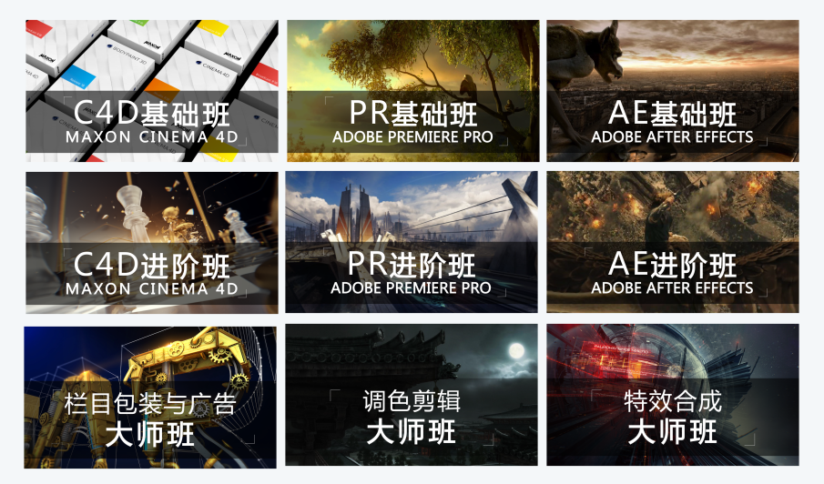 原特效合成行业班、调色剪辑行业班、三维包装行业班更名为 特效合成大师班、调色剪辑大师班和栏目包装与广告大师班,学费暂时不变。